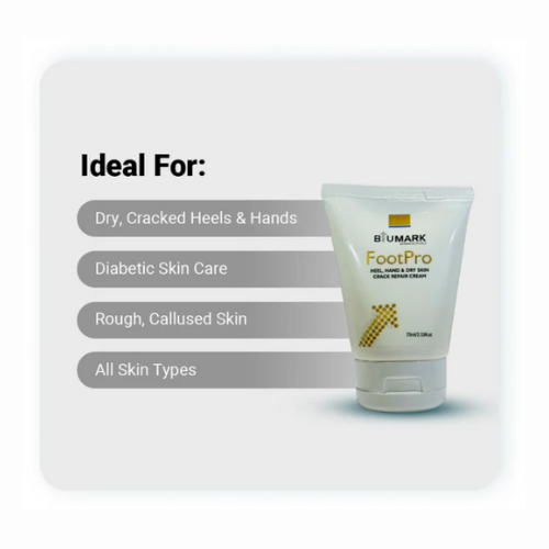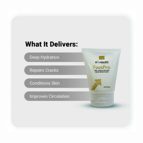 Apply a generous amount of FootPro Heel & Hand Repair Cream to your clean feet. Massage gently, focusing on cracked heels and dry areas. Use daily for optimal hydration and repair.